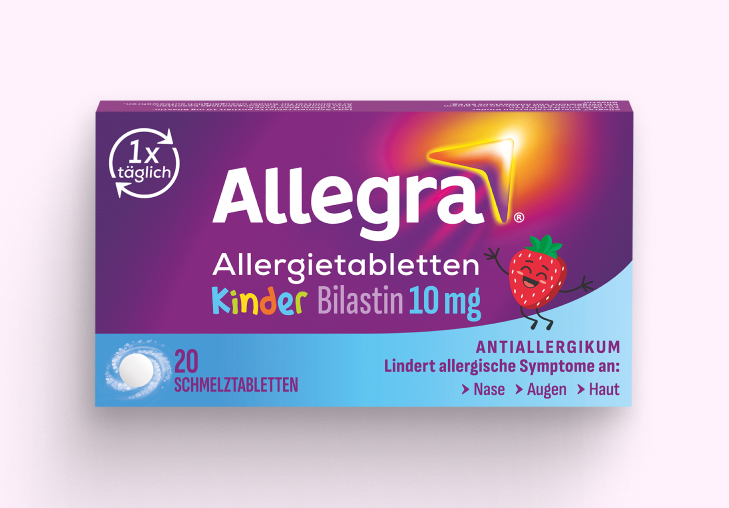 Allegra® Schmelztabletten für Kinder helfen bei allergisch bedingten Symptomen an Nase, Augen und Haut. Sie sind geeignet für Kinder von 6–11 Jahren mit mind. 20 kg Körpergewicht. Die Allergietabletten für Kinder können auch unterwegs leicht eingenommen werden, denn die Schmelztabletten mit Erdbeergeschmack zergehen direkt auf der Zunge. Sie lindern die Allergiesymptome Deines Kindes für 24 Stunden – mit nur einer Tablette am Tag.
