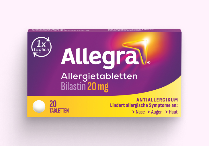 Allegra® Allergietabletten lindern Allergiesymptome, wie eine laufende oder juckende Nase, Niesen, juckende oder tränende Augen sowie Juckreiz, Rötung und Quaddel-Bildung auf der Haut.